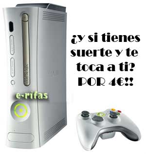 Últimos días de la rifa de la XBOX 360 que se celebra en E-RIFAS!! Recordar que funciona como la rifa de los bares. Hay 100 números (del 00 al 99) y podeis comprar el que querais (si está libre) por 4€. Si coincide con las 2 últimas cifras del sorteo de la ONCE del viernes que viene TE LLEVAS UNA XBOX 360 POR 4€!! Podeis pagar por TARJETA DE CRÉDITO (PAYPAL), por MOVIL (Mediante SMS) o vas al banco e ingresas los 4€!! Toda la info en E-RIFAS
