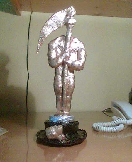 Pos de arcilla, además de arcilla sin comprar, de la que se obtiene revolviendo horas la tierra; varias horas en concreto,y varios lumbares deshechos después de estrujar la masa revuelta de piedras, arenilla y arcilla, fui capaz de sacar 50 kilos de una plasta que parece arcilla. jeje, y después, el pelu me comentó que necesitaría estatuillas para la gala. Así que, como me sobra bastante, pues me puse a ello, y salió ese "papel albal". Siento mucho que no me quedara mejor, pero ni soy actor ni alfarero. Un saludo.